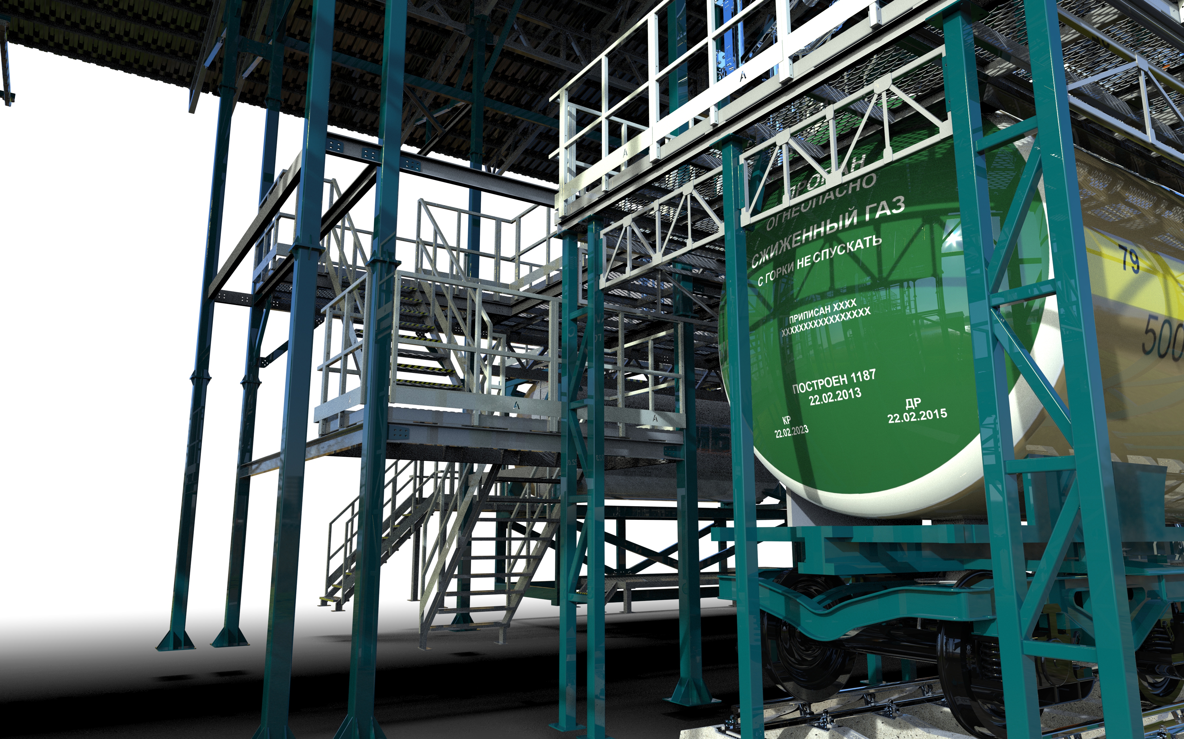 Железнодорожная цистерна: разделена на две секции — для ЛВЖ и СУГ, с комплектом технологических люков и поручней.